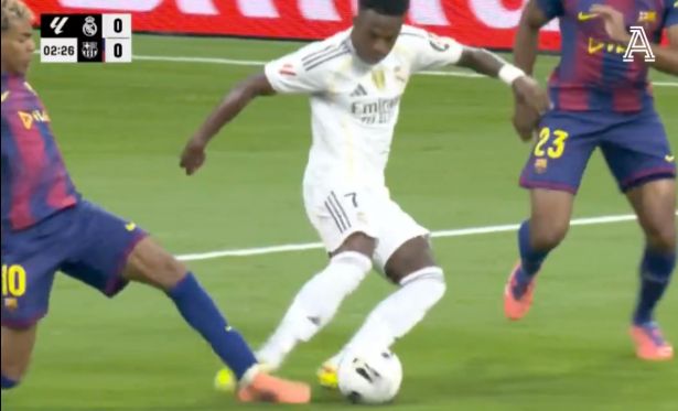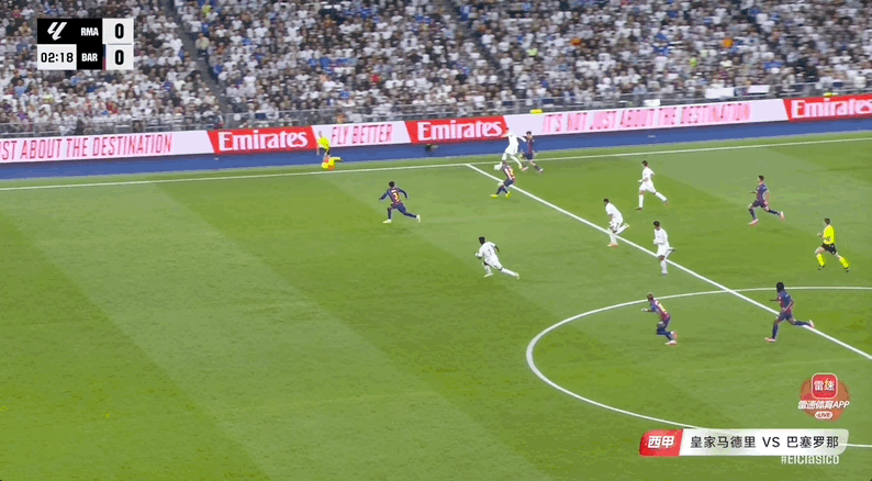 比赛第2分钟,维尼修斯带球突入禁区内倒地,主裁判起初认为亚马尔绊倒维尼修斯,判罚点球。之后VAR介入,主裁判亲自去查看了VAR,最终判罚维尼修斯的脚踢到了亚马尔,点球判罚取消。