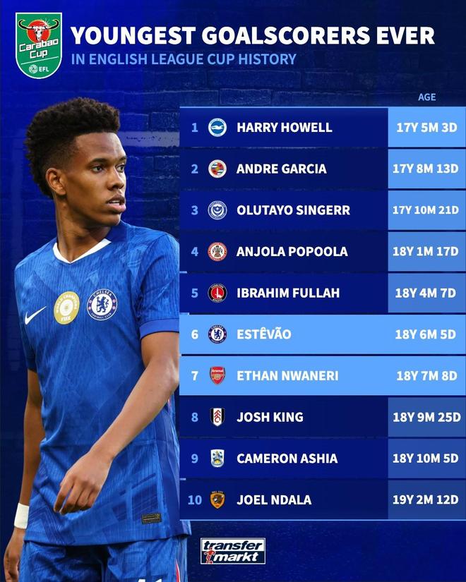 18岁,埃斯特旺与恩瓦内里排英联杯历史最年轻进球榜第6和第7